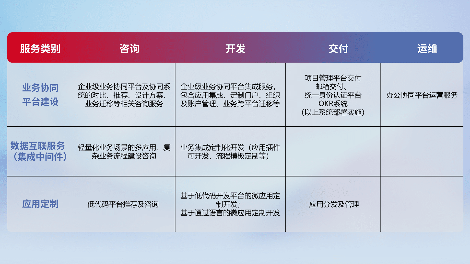 针对钉钉、、企微、、、、IDaas等平台级产品提供产品的规划、、方案、、、、交付、、定制化开发等服务,,实现如统一协同办公、、、、智能客户服务、、、混合会议管理、、智能数据查询、、、、等业务场景,,实现数字化转型。。