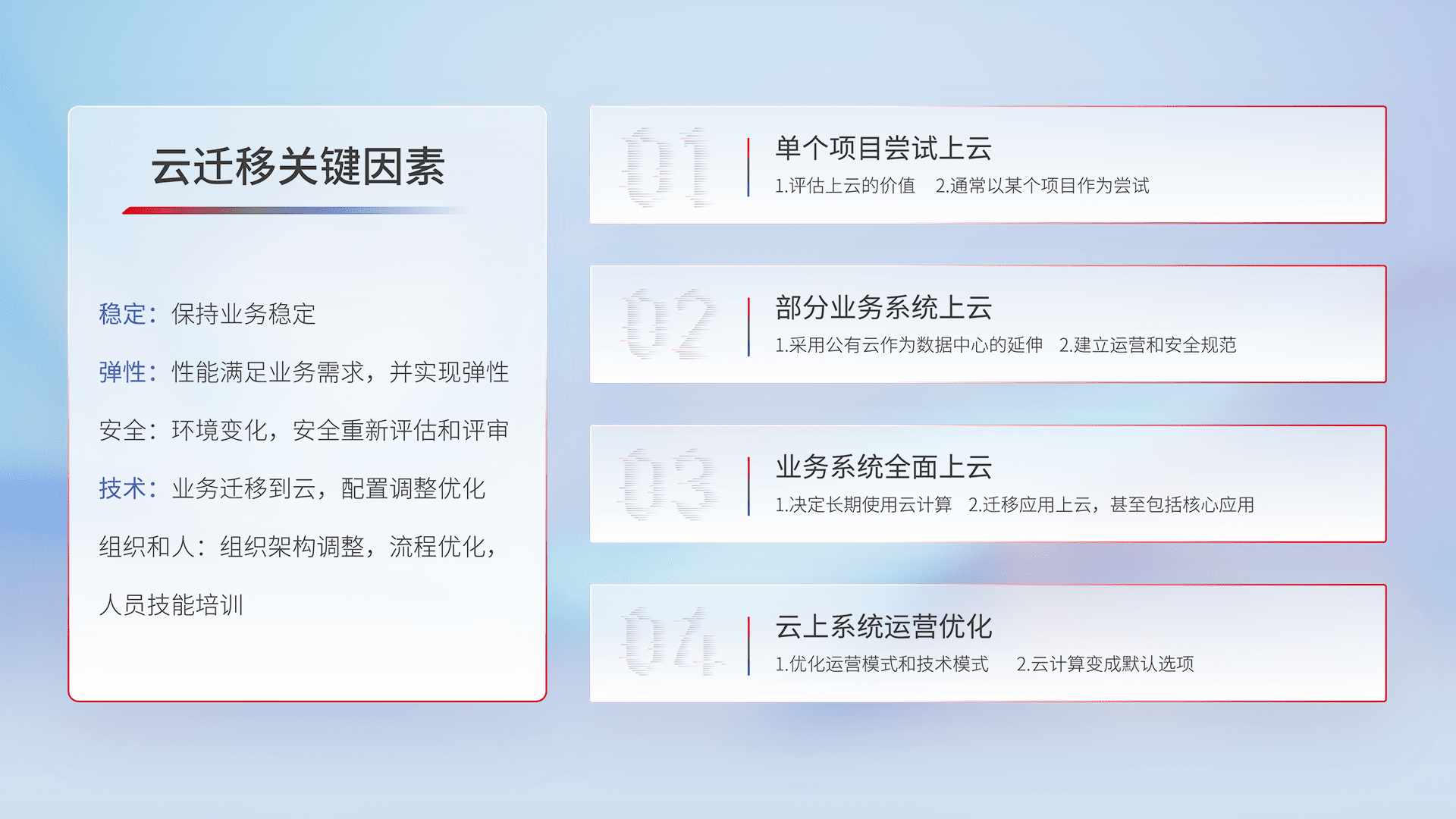 结合实际业务,,,,从规划设计、、、、云平台选型、、、云原生改造、、数据迁移、、集成交付,,迁移全过程为客户识别最佳上云路径,,,做好风险识别管理,,,,设计网络架构、、身份权限、、安全审计合规、、、操作审计、、、、日志审计、、、监控告警策略、、、、多站点容灾设计等,,,,对云上基础设施进行整体规划,,,提升IT治理水平,,以满足弹性、、、高可用、、、、高性能的需求。。。。