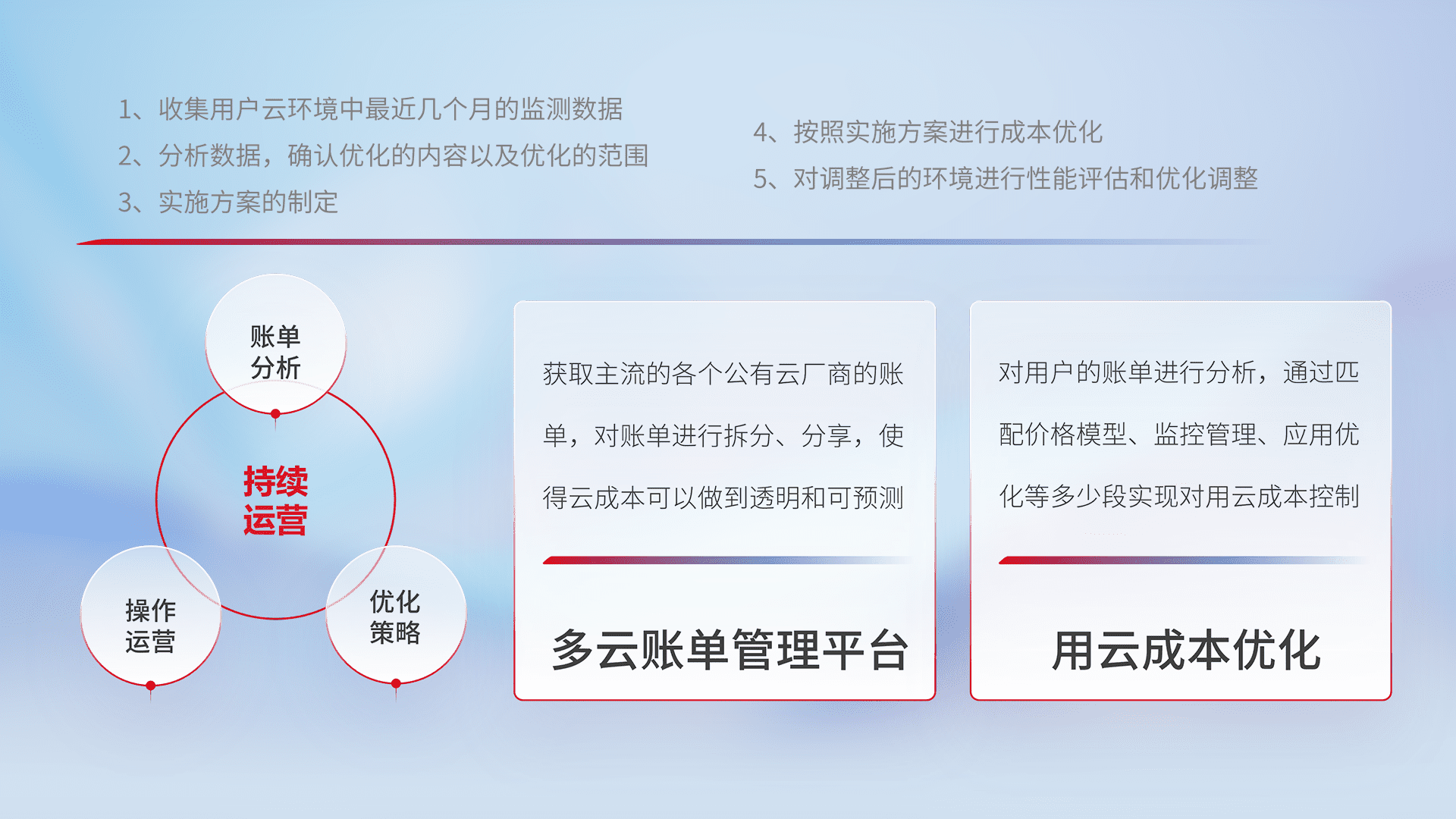 通过多云纳管,,以统一的资源数据模型把客户的云资源进行抽象和封装,,进而实现对多云资源的统一操作,,,保障云资源管理的可靠性、、、、稳定性与可用性。。量身定制化运维内容,,,,配置、、、开发运维、、补丁管理、、、备份、、、、监控、、认证和访问管理、、、、审计和日常巡检等,,,保障在用云过程中的可靠度,,,稳定度以及高可用率。。。
