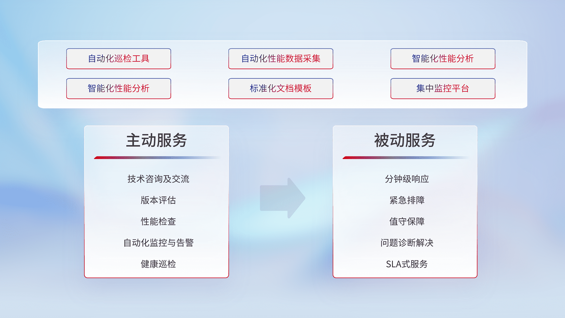 智能化工具和标准化文档,,,,保障服务质量,,,提供主动服务(包含技术咨询、、、、版本评估、、、、性能检查、、自动化监控与告警、、、健康巡检)和被动服务包含(分钟级响应、、、、紧急排障、、、、值守保障、、问题诊断解决、、SLA服务)。。。。